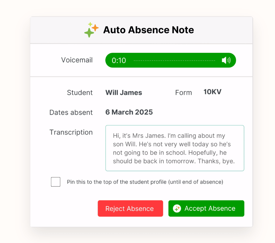 This auto-transcription tool is focused on solving a single issue which happens to be a huge administrative headache for schools. When parents call in sick, they're all calling between 8 and 9. With just a handful of staff in the office, that's a major pain to answer the phones.